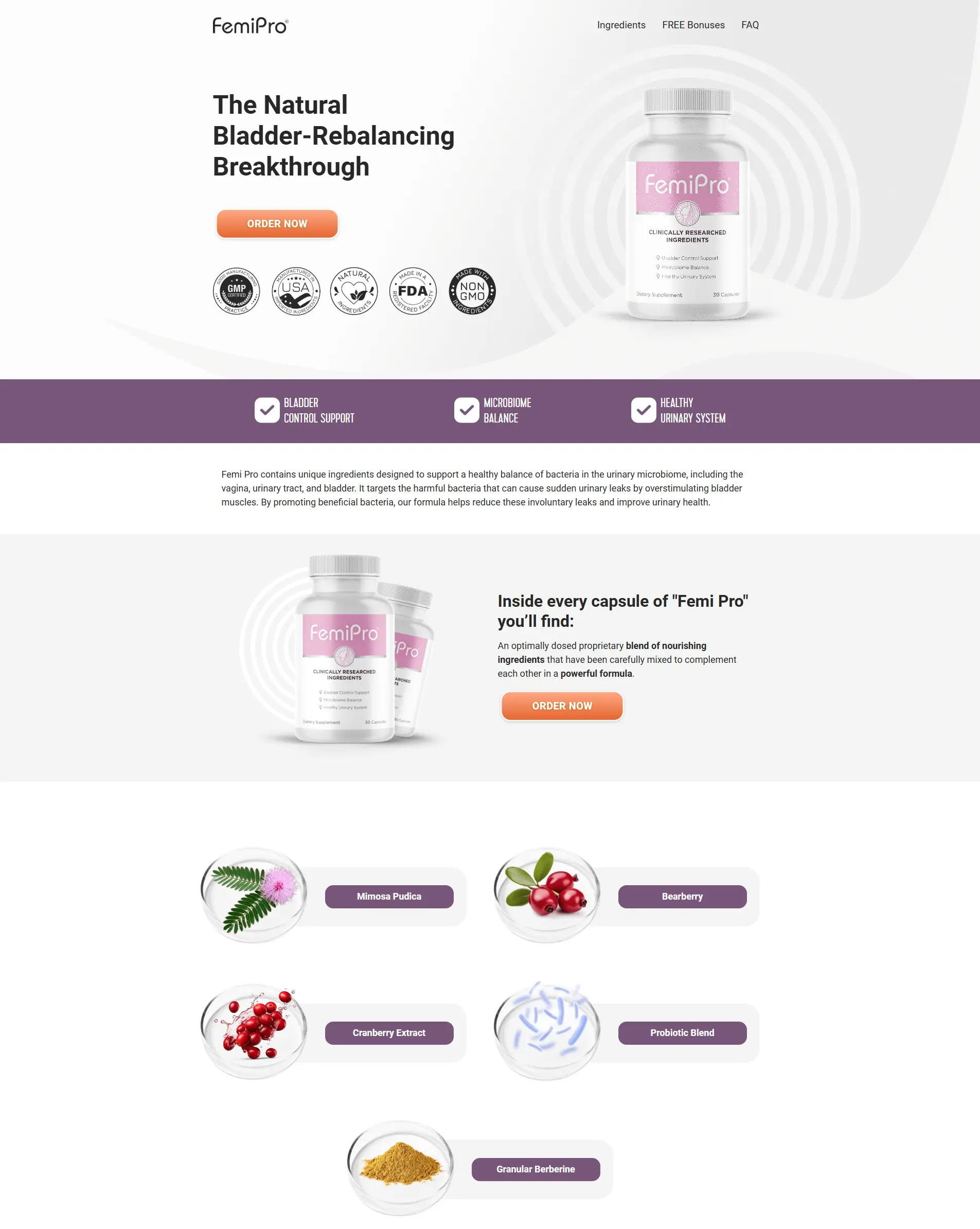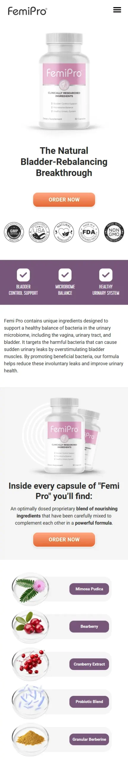Femi Pro is a natural dietary supplement formulated to support bladder control, urinary balance, and feminine wellness. Its formula helps maintain a healthy urinary microbiome and supports normal bladder function, promoting daily comfort and confidence.